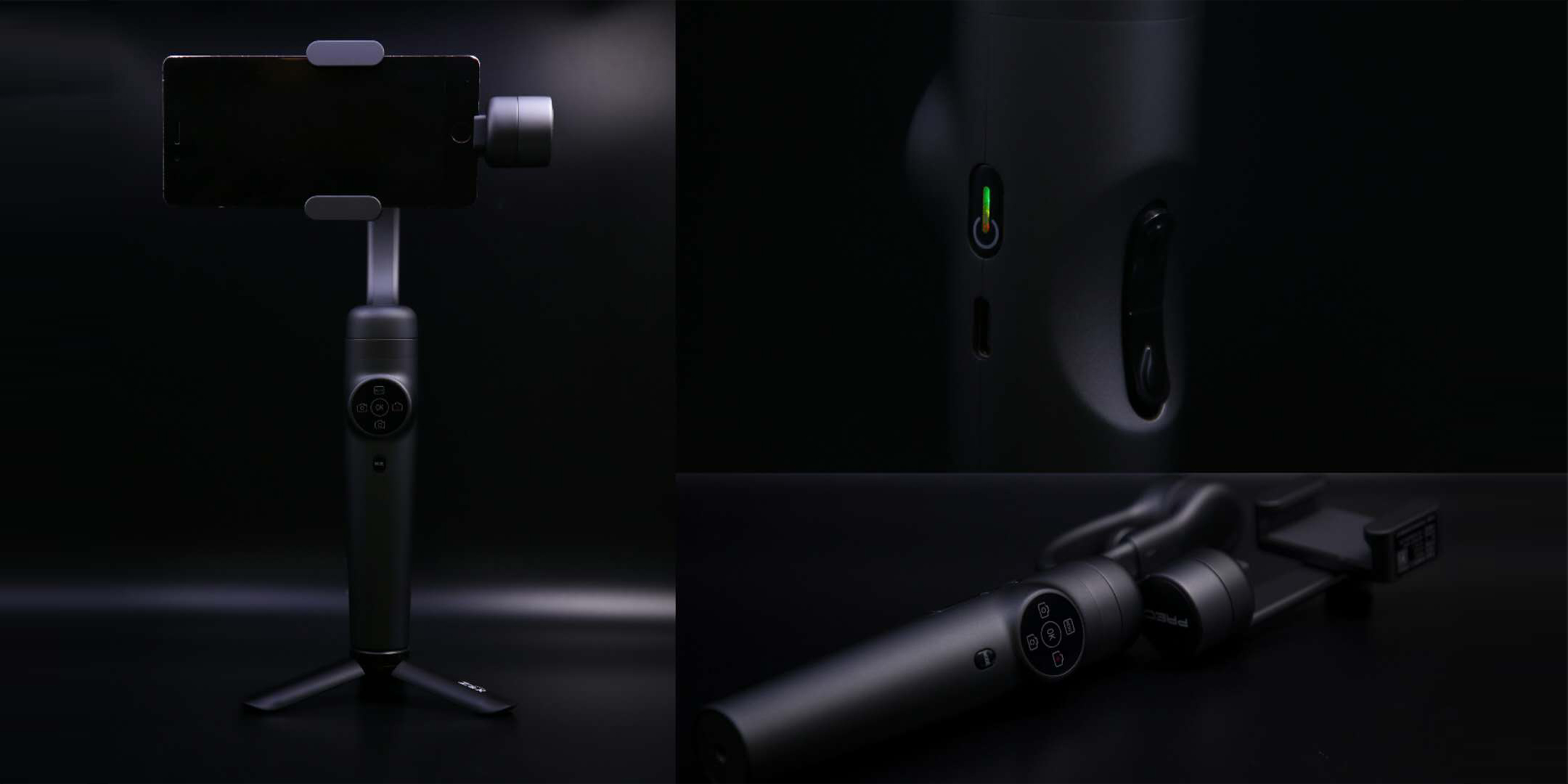 這款手持云臺(tái)主要是黑色,采用了航空鋁、高精密五軸CNC材質(zhì),全曲面,圓角轉(zhuǎn)軸,適用多種環(huán)境拍攝,比較靈活,按鍵較多,看起來酷炫,專業(yè)感十足。手握部分設(shè)計(jì)符合人體工程學(xué),舒適感不錯(cuò),不容易感覺疲憊。
