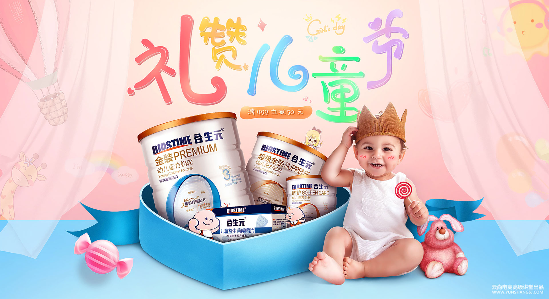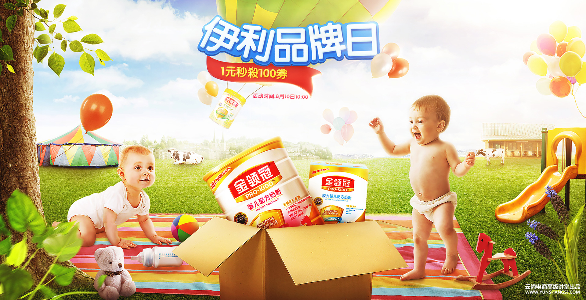 伊利品牌活動日,活動主題圍繞“禮贊兒童節”展開,在設計上選用了幾個經典的兒童活動場景,讓產品、賣點與生活場景、消費場景自然結合起來;運用小元素的表現,在細節上增添了趣味性和互動性。