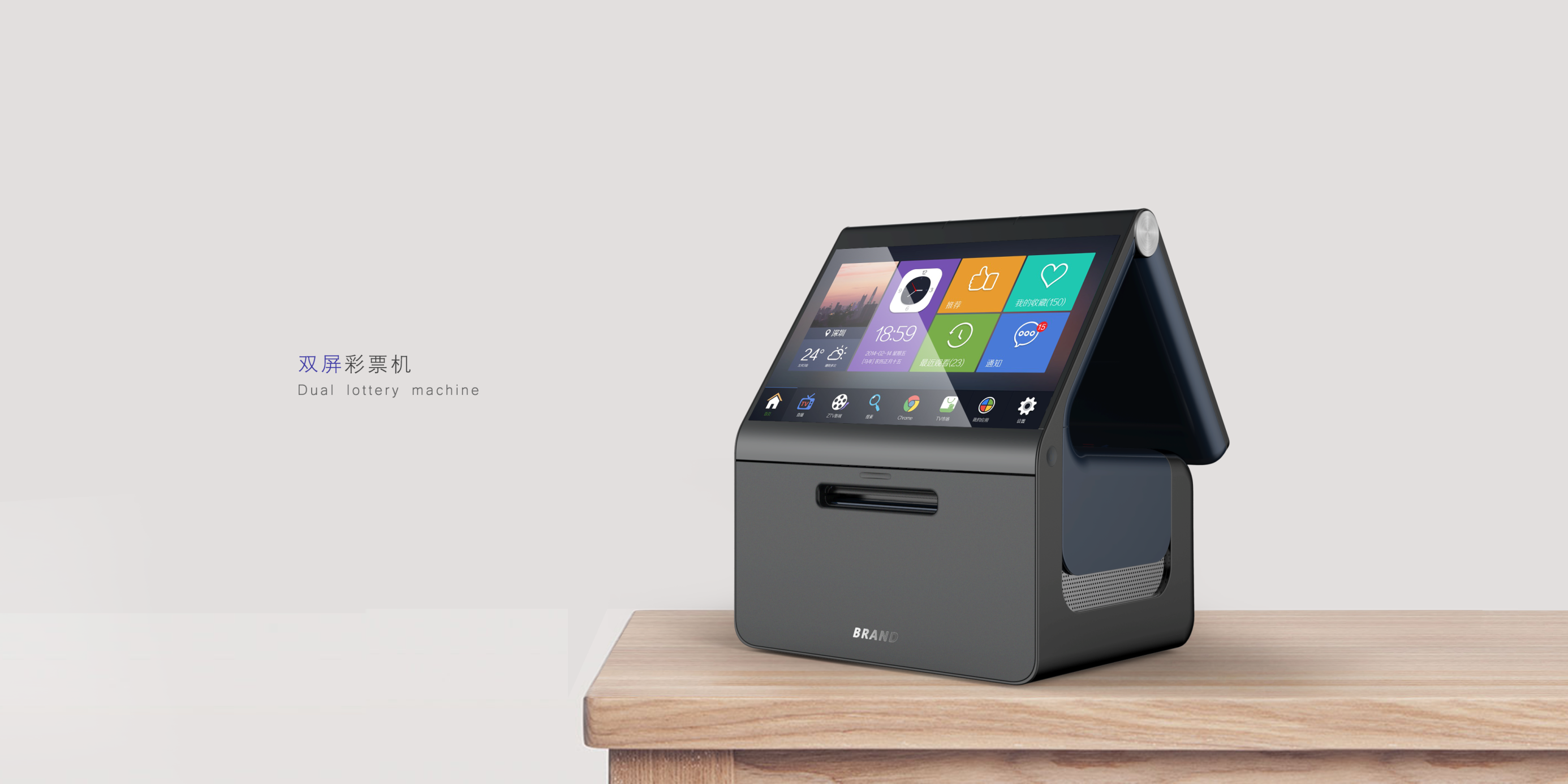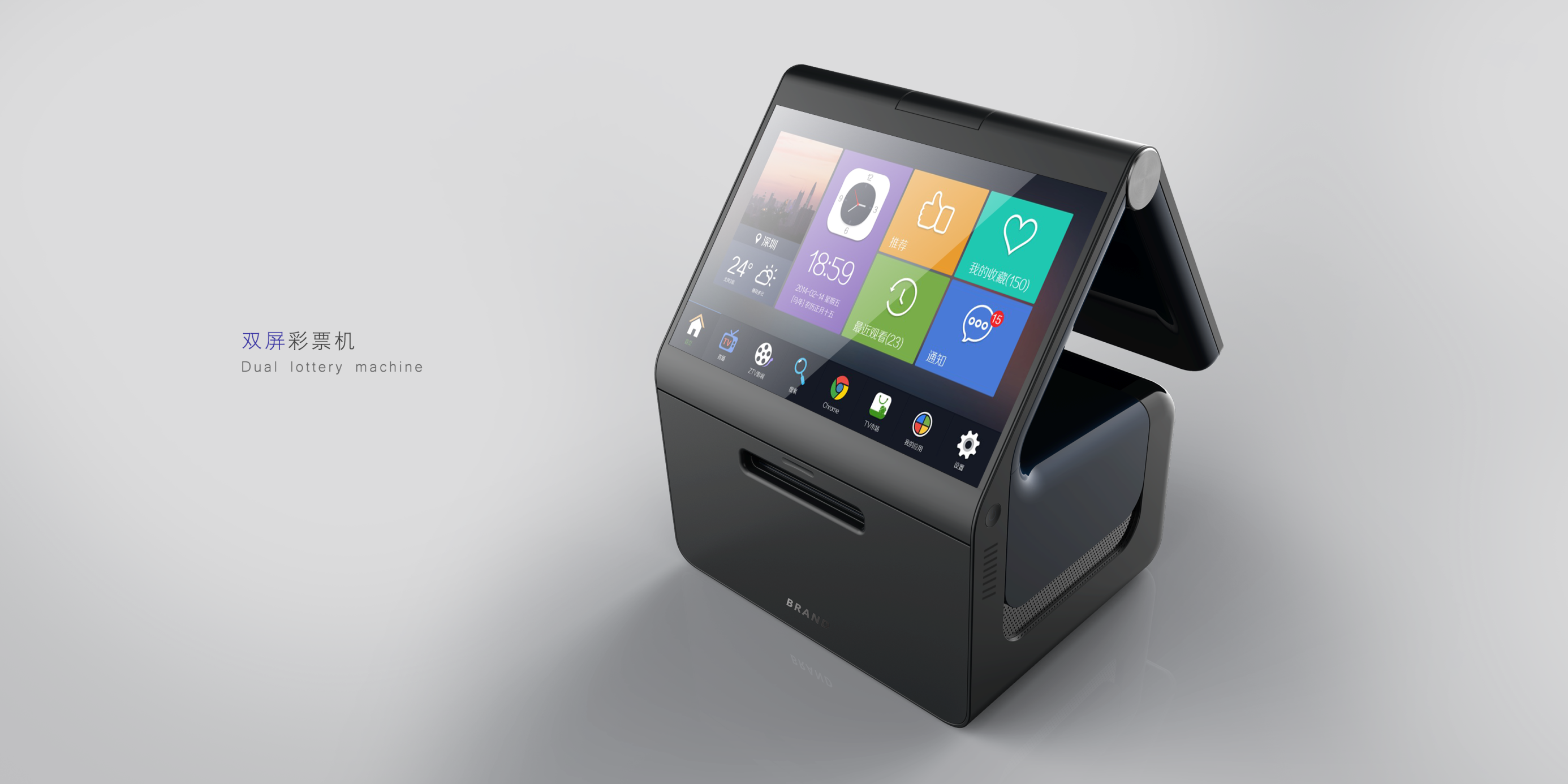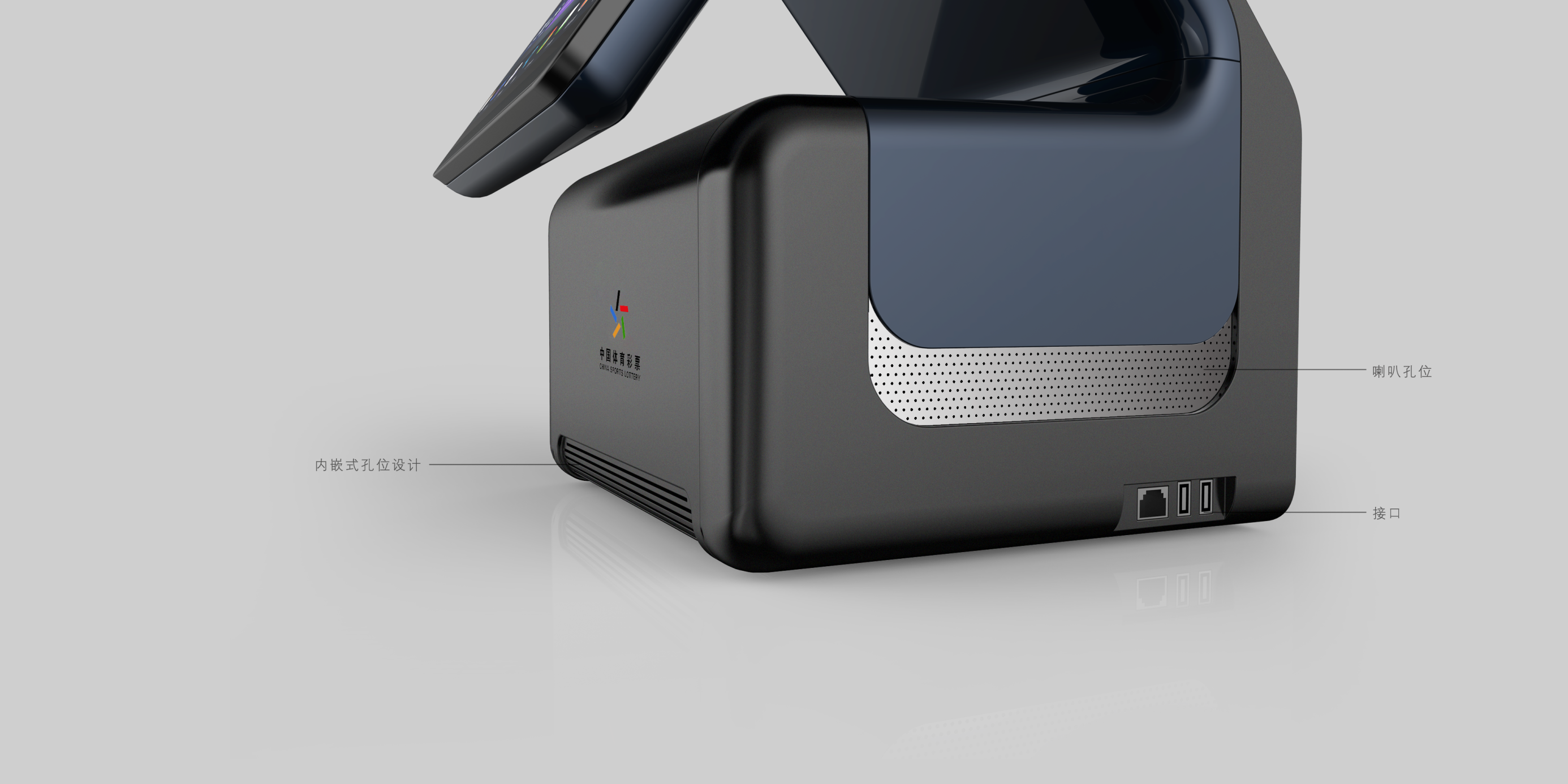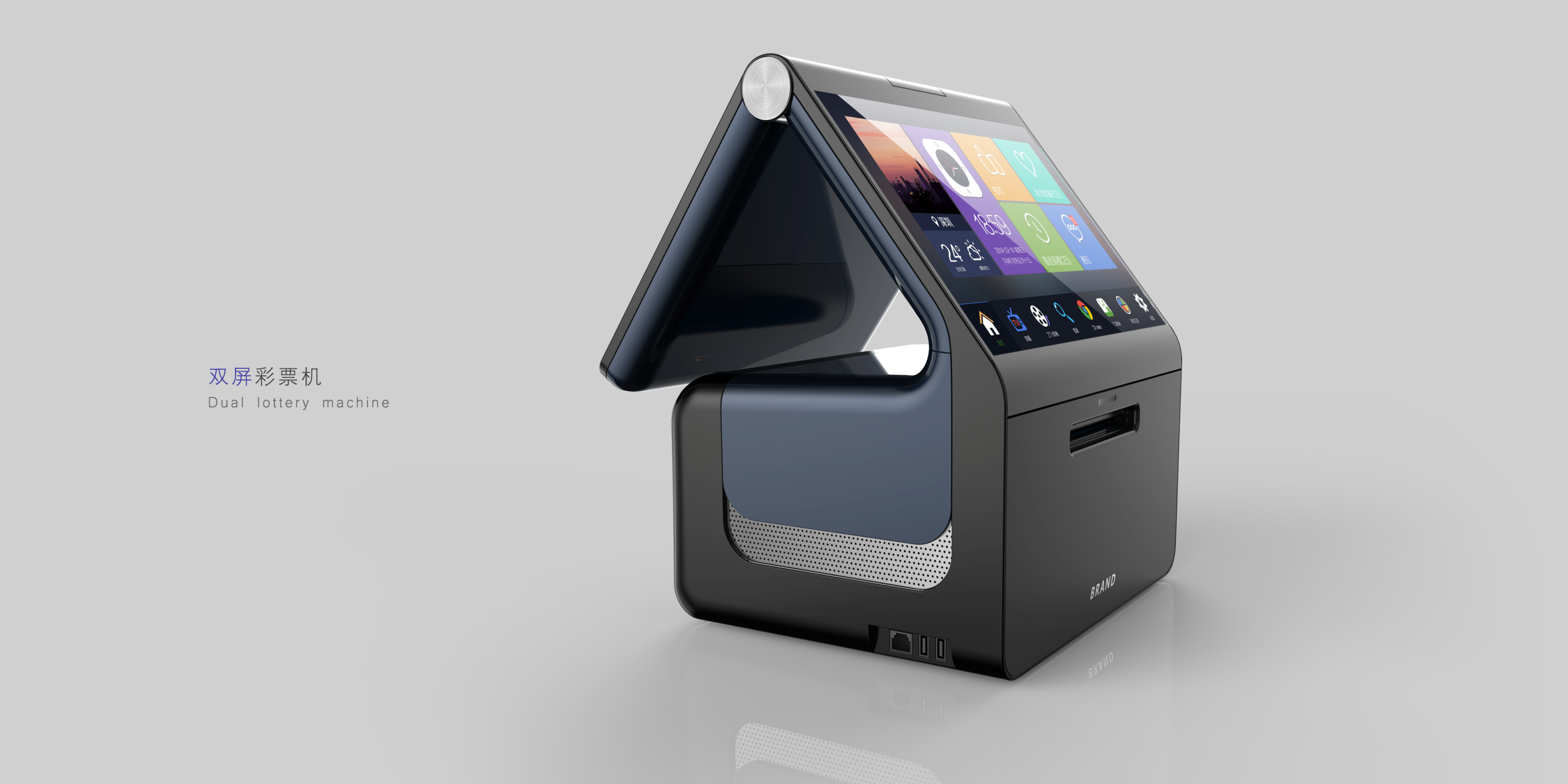 在當今社會,買彩票已經(jīng)是很多人的一種理財、休閑的娛樂方式。此次雙屏彩票機產(chǎn)品設(shè)計是智加設(shè)計團隊的又一經(jīng)典案例,從前期的市場分析,到產(chǎn)品的整體設(shè)計,再到產(chǎn)品的試制,以及最后的小批量生產(chǎn),智加設(shè)計團隊為客戶提供了滿意的整體解決方案。這款雙屏彩票機整體一體設(shè)計簡潔大方,方圓之間結(jié)實可靠,黑藍灰搭配穩(wěn)重大方凸顯行業(yè)特征,用顏色與R角對彩票機進行劃分使其更加薄,機身內(nèi)嵌網(wǎng)孔防塵防水,突出的超薄雙屏設(shè)計十分便捷,讓用戶有了更好的產(chǎn)品體驗。